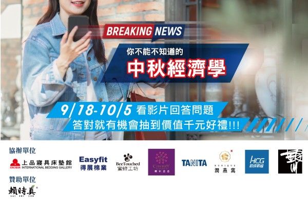 9/18-9/29鎖定「中廣流行網 i like radio」、「中廣音樂網」、「中廣新聞網」「中秋經濟學」新聞特輯,更加碼「中秋經濟學」有獎徵答活動,邀你一起同樂,中秋特別報導請鎖定「中廣新聞網 YouTube頻道」、「中廣活動專區」,挑選一份好禮送給親朋好友!9/18-10/5記得上臉書「中廣活動專區」看影片回答問題,答對就有機會獲得超值的中秋好禮喔!